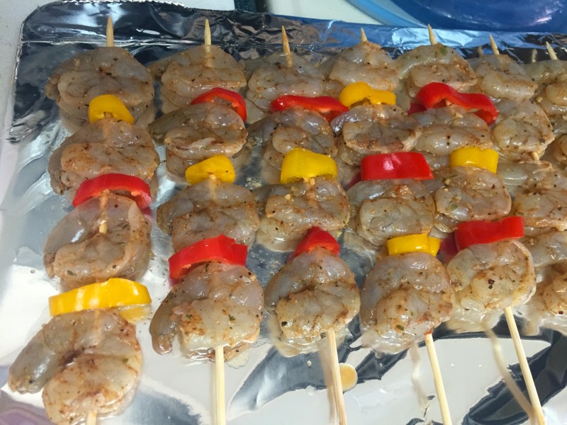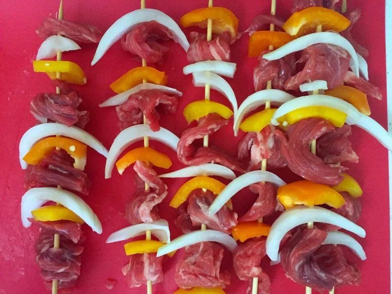 Prep steak by cutting into 2-inch strips. Prep peppers by cutting into 1-2 inch pieces. Alternating, push protein and bell pepper pieces through skewers. Use 4 pieces of protein for each skewer.