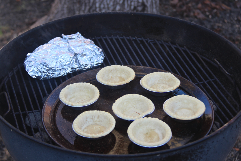 Place the foil packet on the grill and allow it to cook for 20 minutes until the apples are completely softened. As the apples cook, place the frozen pie shells on a small baking pan and place on to the grill. Cover the grill and allow the pie shells to cook, for approximately 15 minutes until lightly browned.