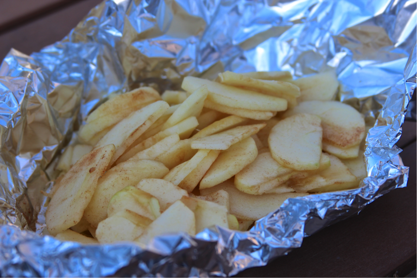 Prepare grill for medium heat cooking. Toss apple slices with cinnamon and sugar and wrap in a double layer of aluminum foil.