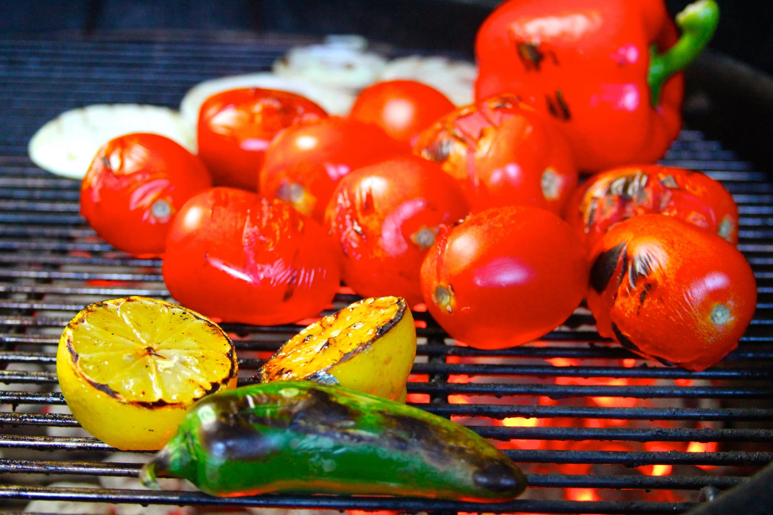 Place tomatoes, jalapeno, red bell pepper, sliced onion, and lemon on the grill and cook until lightly charred (approximately 2 minutes for the lemons, 4 minutes for the onions and jalapeno, 5-7 minutes for the tomatoes, and 8-10 minutes for the bell pepper). Remove the ingredients from the grill.