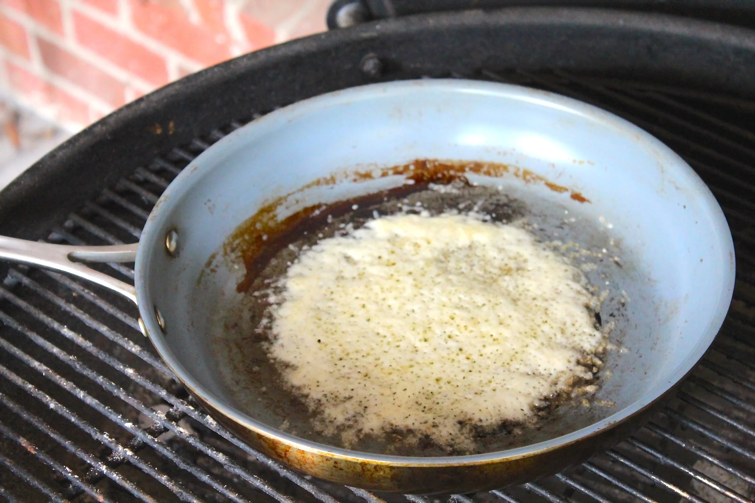 Place non-stick skillet on the grill and add 1/3 cup grated parmesan in circle, approximately 1 inch wider than the burger patties. Cook the cheese for approximately 2 minutes until melted together and lightly browned around the edges.