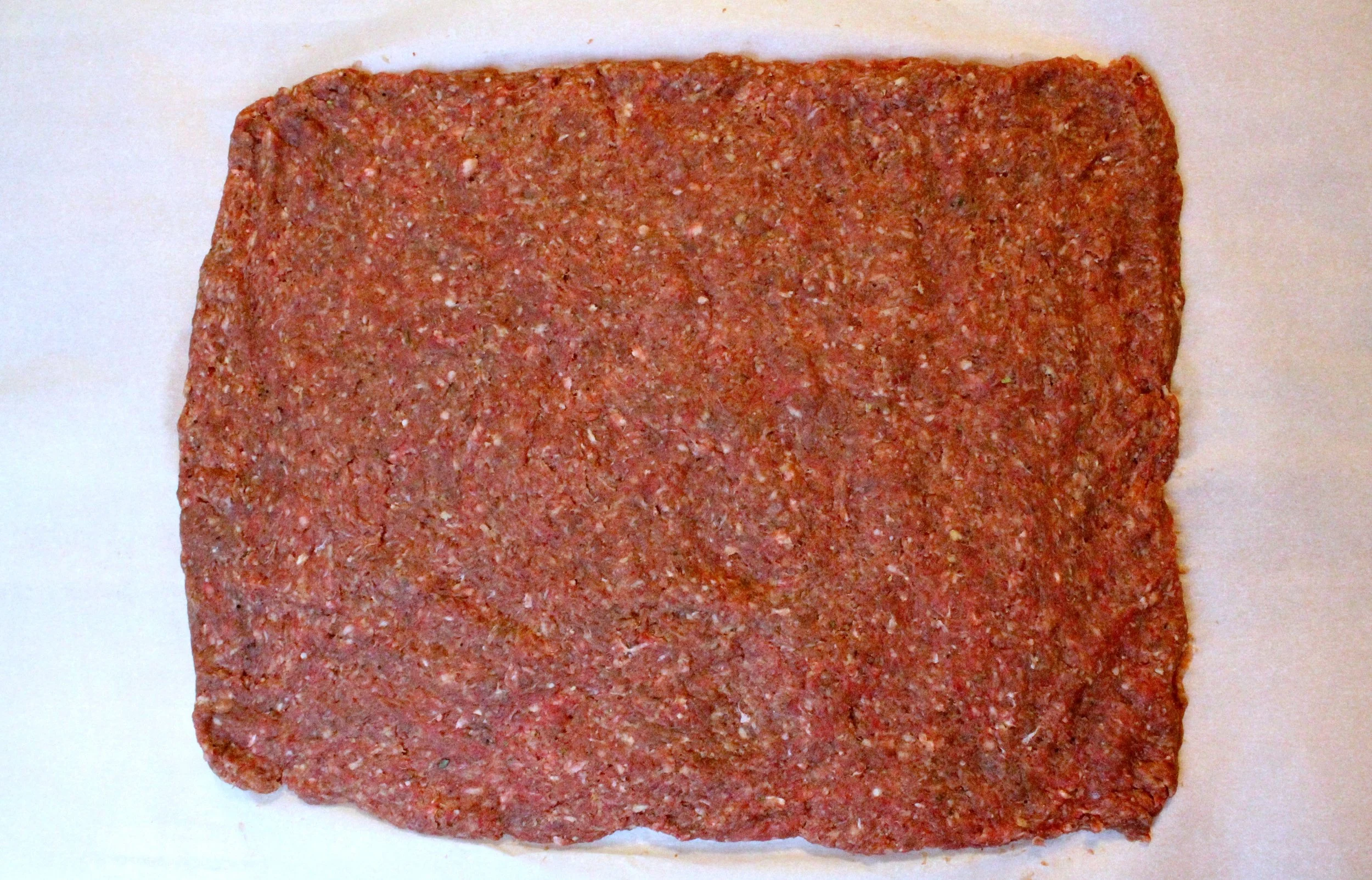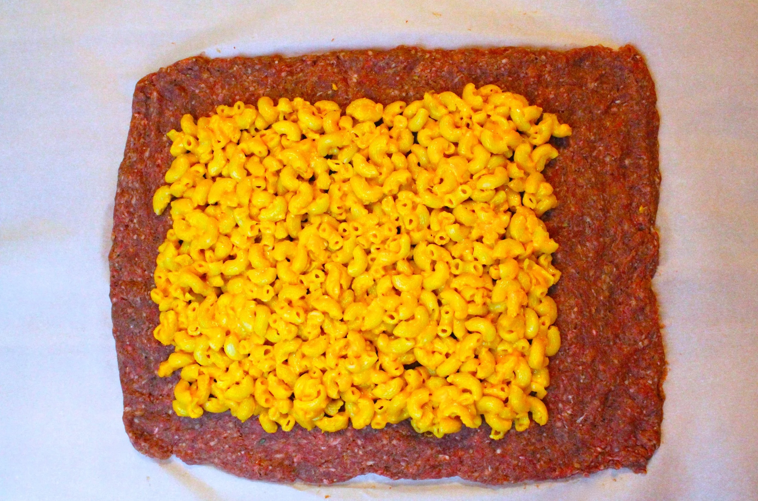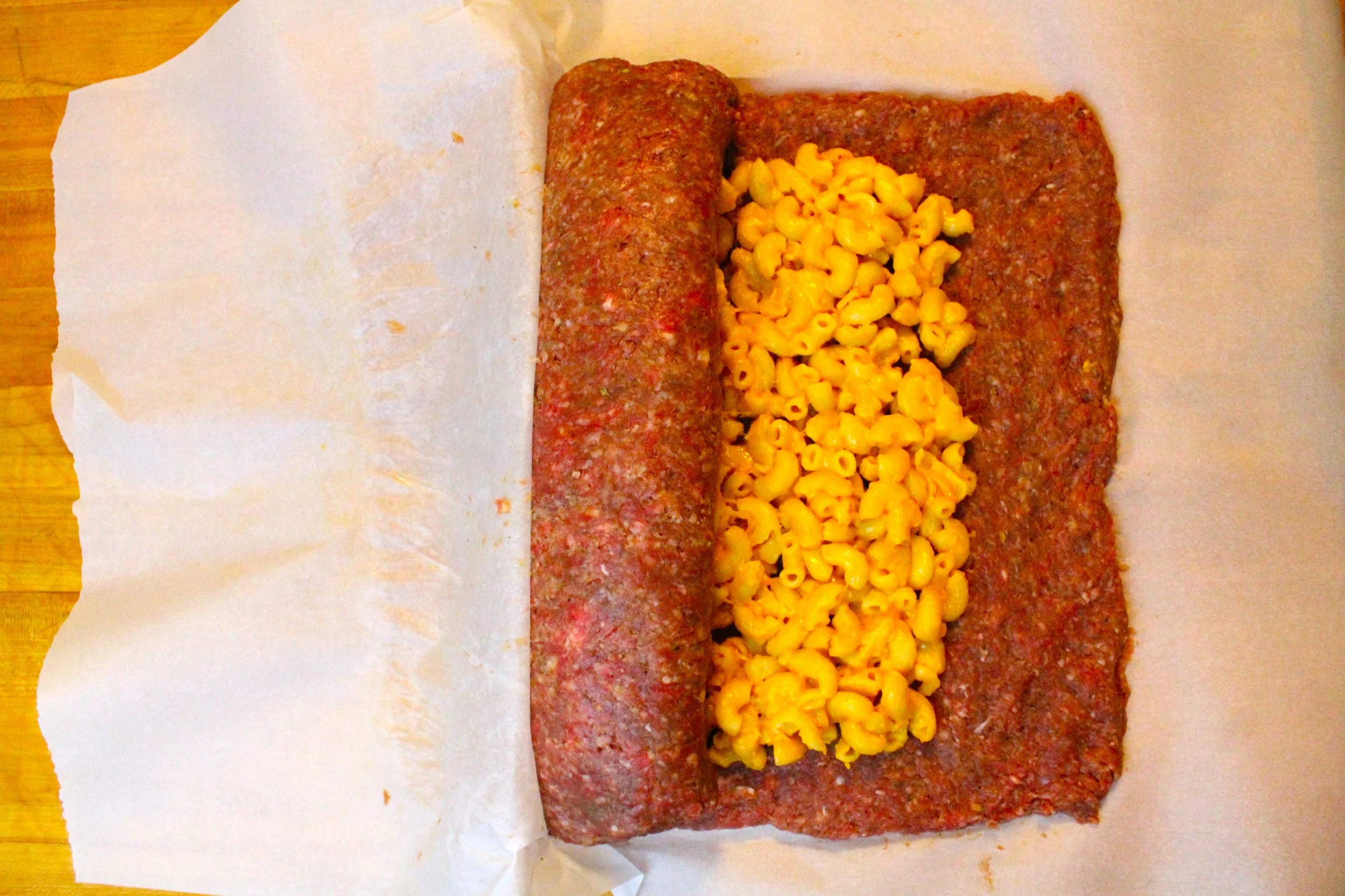Lay one sheet of parchment paper on a cutting board and spread meatloaf mixture into a ½-inch thick rectangle. Spread an even layer of macaroni and cheese across the top of the meatloaf mixture, leaving a 1-inch border on one short side of the rectangle, a 1-inch border on both longer sides, and a 3-inch border on the remaining short side.