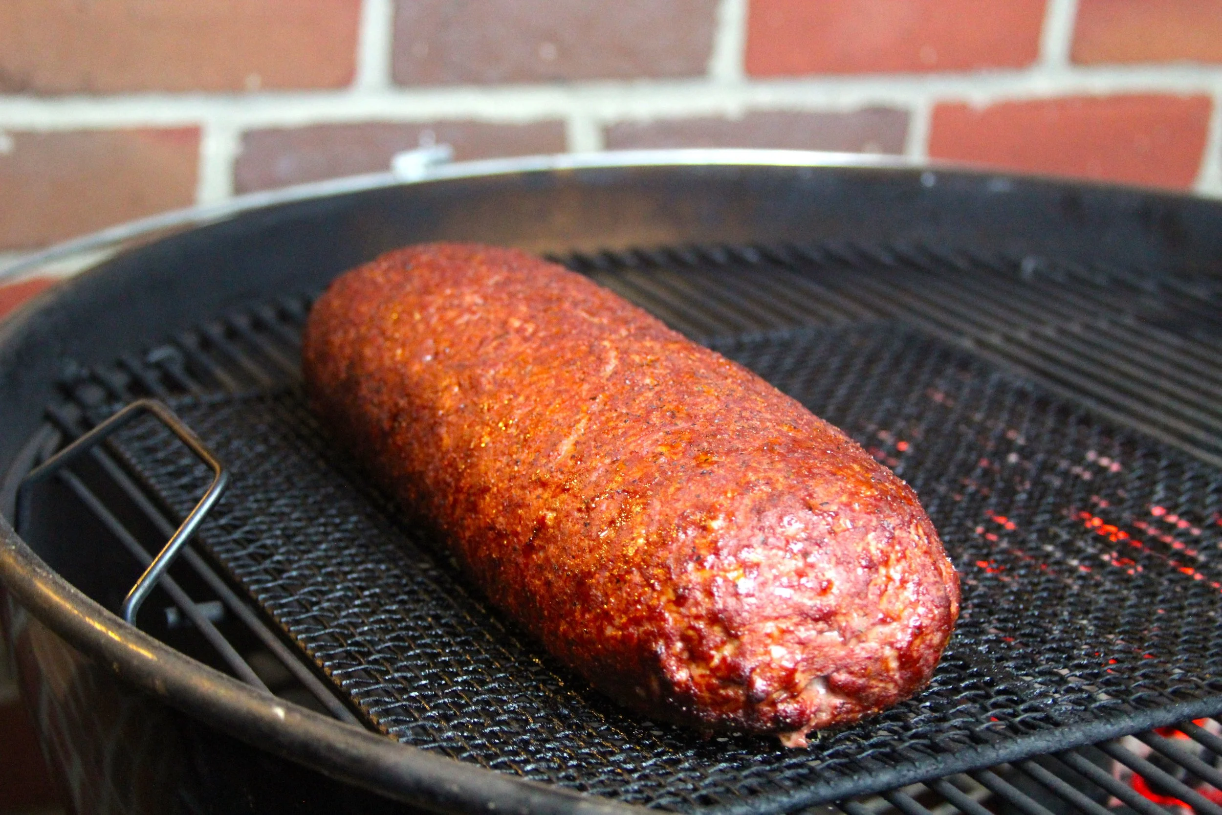 Add 2-3 chunks of your favorite smoking wood to the charcoal for maximum smoke flavor. Gently move the stuffed meatloaf onto a cooling rack (this will make it easier to remove the meatloaf from the grill once it is cooked) and place it on the cool side of the grill. Cover the grill and allow it to smoke until the center of the beef has reached an internal temperature of 160°F, approximately 45 minutes.