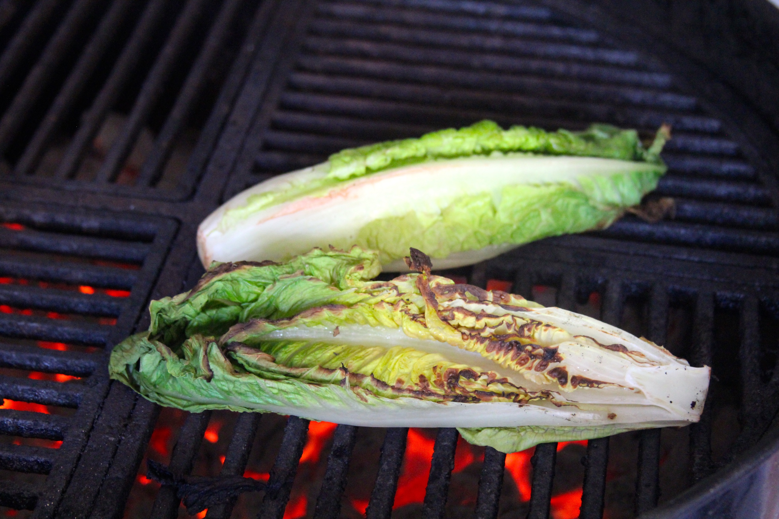 Place the halved hearts of romaine on the grill cut side down. Allow them to grill for 3-4 minutes, moving them every minute until nicely charred.