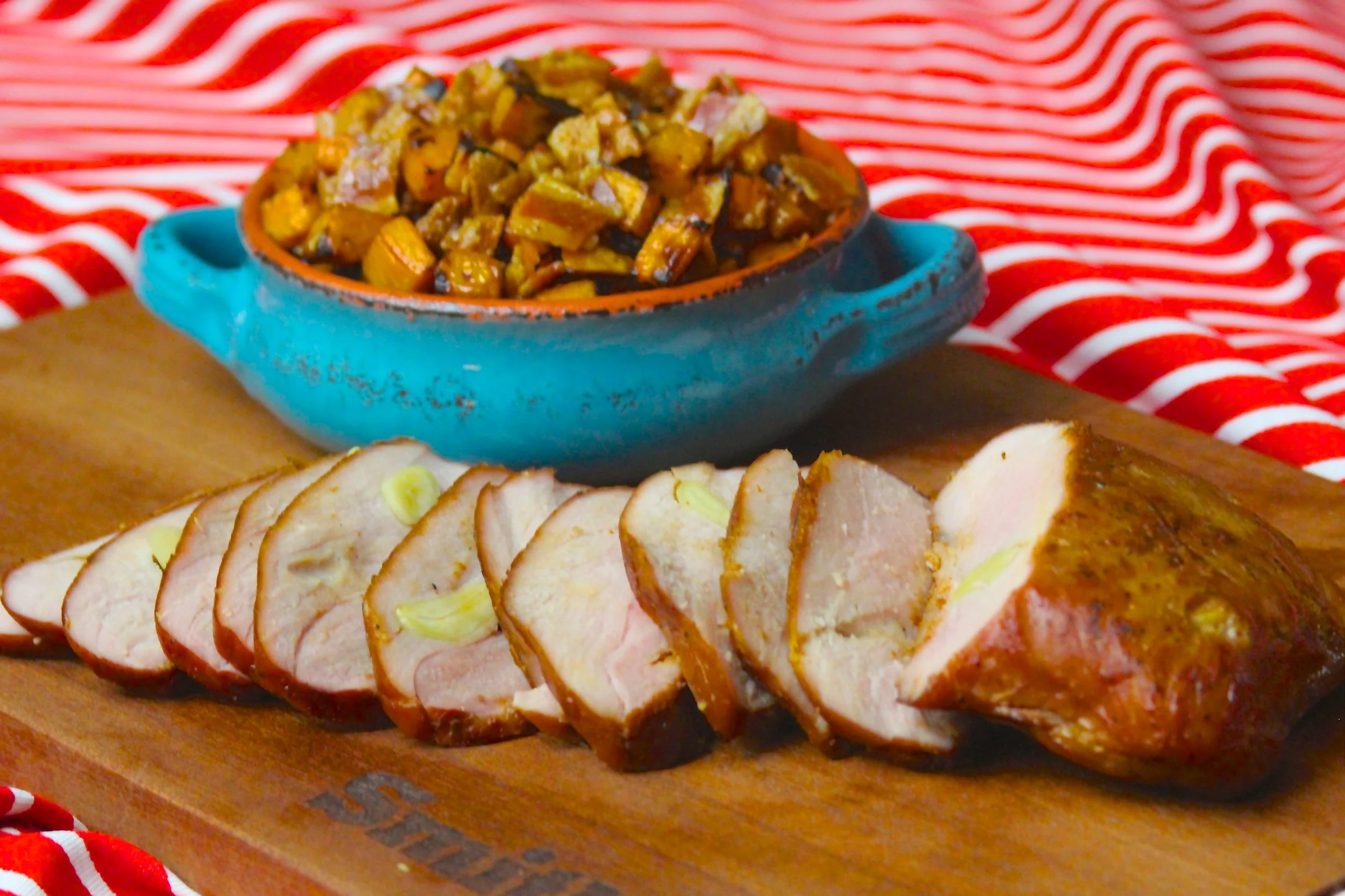 Smoked Garlic Studded Pork Sirloin with Sriracha-Maple Glazed Sweet Potato Hash